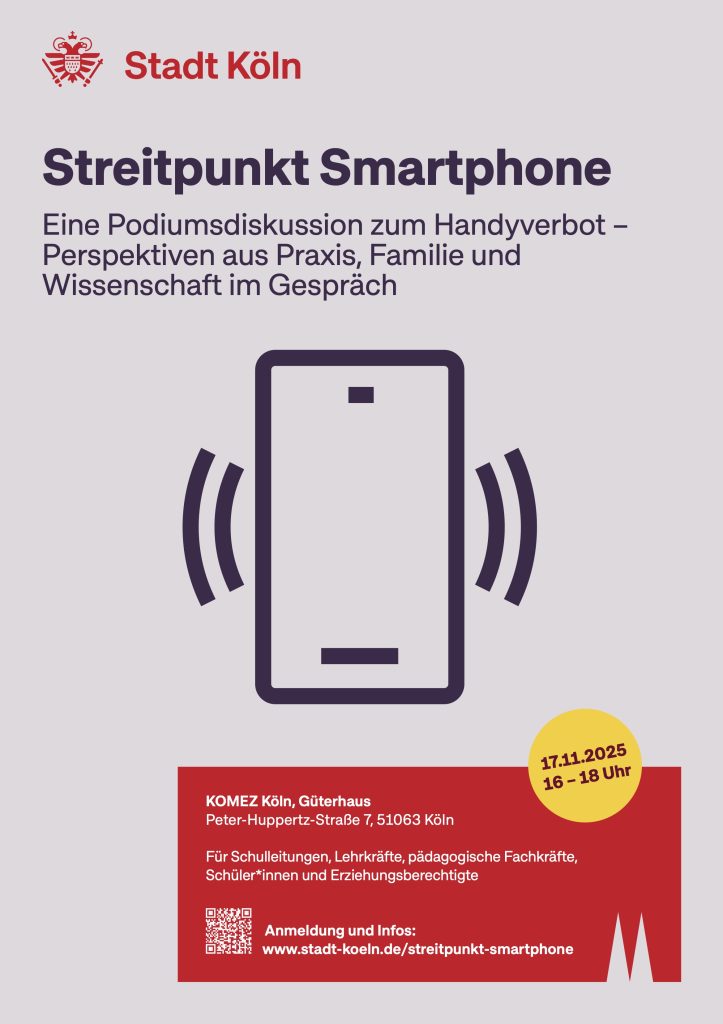 Unter dem Titel „Streitpunkt Smartphone – Handyverbot an Schulen?“ lädt das KOMEZ Köln am 17. November 2025 von 16:00 bis 18:00 Uhr zu einer spannenden Podiumsdiskussion ein. Vertreter*innen aus Schulleitung, Elternschaft, Schülerschaft und Wissenschaft diskutieren über Chancen und Grenzen von Smartphones im Schulalltag.