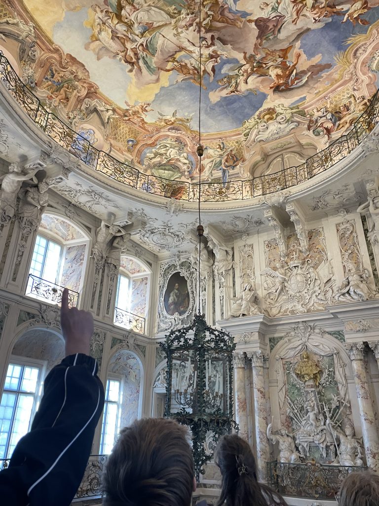 Sehr beeindruckend ist vor allem das Treppenhaus, das früher als Empfangsraum diente. Es weist viele Schnörkel auf und beeindruckt durch ein riesiges Deckengemälde, das so gemalt ist, dass man denkt, es sei eine Kuppel. Es fühlte sich wie eine Reise in die Vergangenheit an, als man die Treppe hochschritt. Sehr interessant war auch, dass man in sehr vielen Räumen geheime Türen für Bediensteten entdecken konnte. Wir durften sogar durch eine Geheimtür in der Bibliothek gehen.