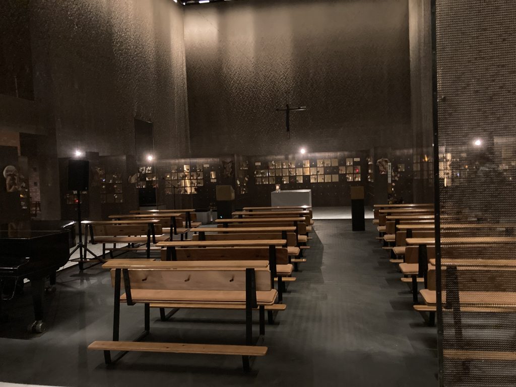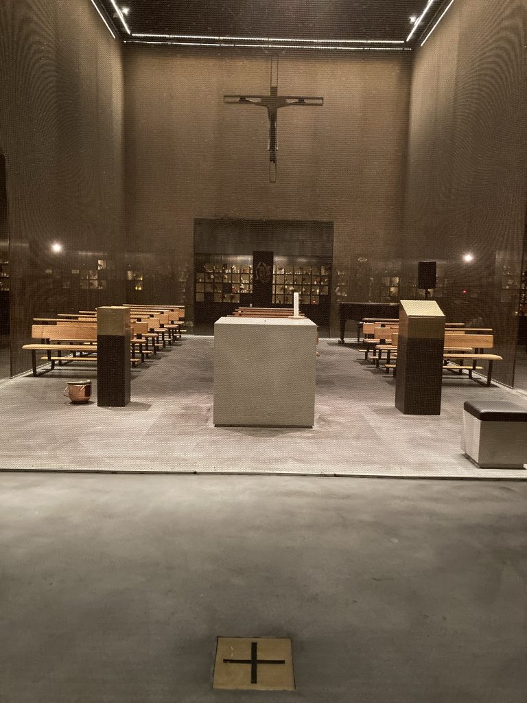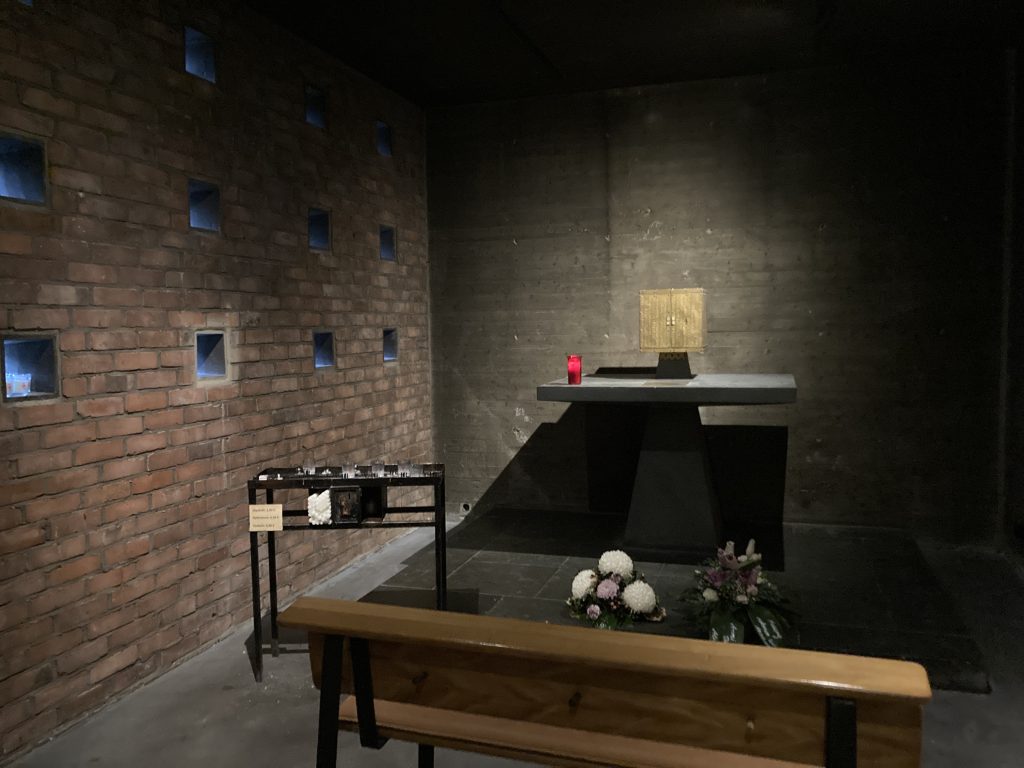 Im Gottesdienstraum werden die Trauerfeiern als Messe oder Wortgottesdienst für die Menschen gefeiert, die hier beigesetzt werden. Auch Nicht-Getaufte Menschen können hier beerdigt werden. Die Trauerfeiern finden allerdings immer in einem christlichen Rahmen statt. Wir erfuhren, dass es Platz für 2500 Urnen gibt, von denen etwa 70% belegt oder reserviert sind. Einige Gräber bieten auch für zwei Urnen Platz, z.B. wenn Ehepaare im gleichen Grab beerdigt werden möchte.