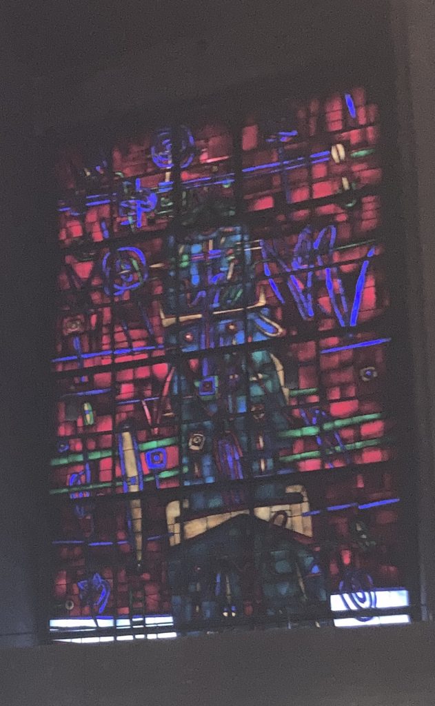 Nach dem Eintreten erkundeten wir zunächst selbst in Stille den Kirchenraum und ließen diesen besonderen Ort auf uns wirken: Ein Drahtvorhang trennt den Gottesdienstraum vom Urnenbereich. Dieser Vorhang, der je nach Licht mehr oder weniger zu durchschauen ist, soll an den Übergang zwischen Leben und Tod erinnern. Außerdem verleihen die bunten Fenster dem Raum eine schöne Atmosphäre.