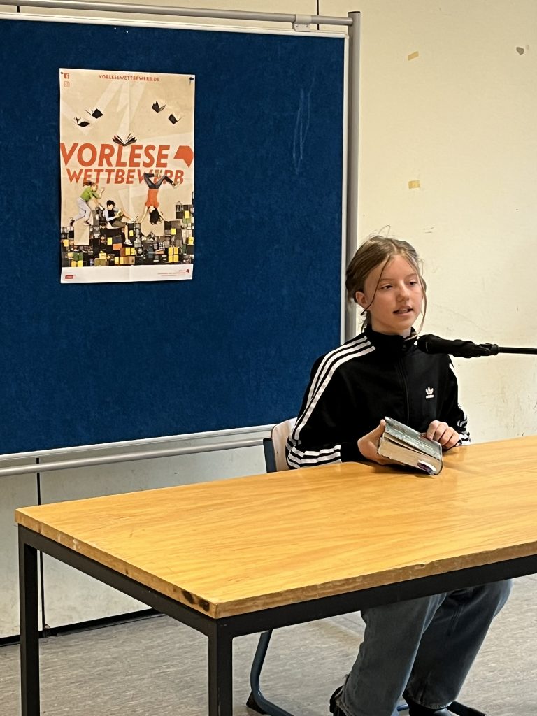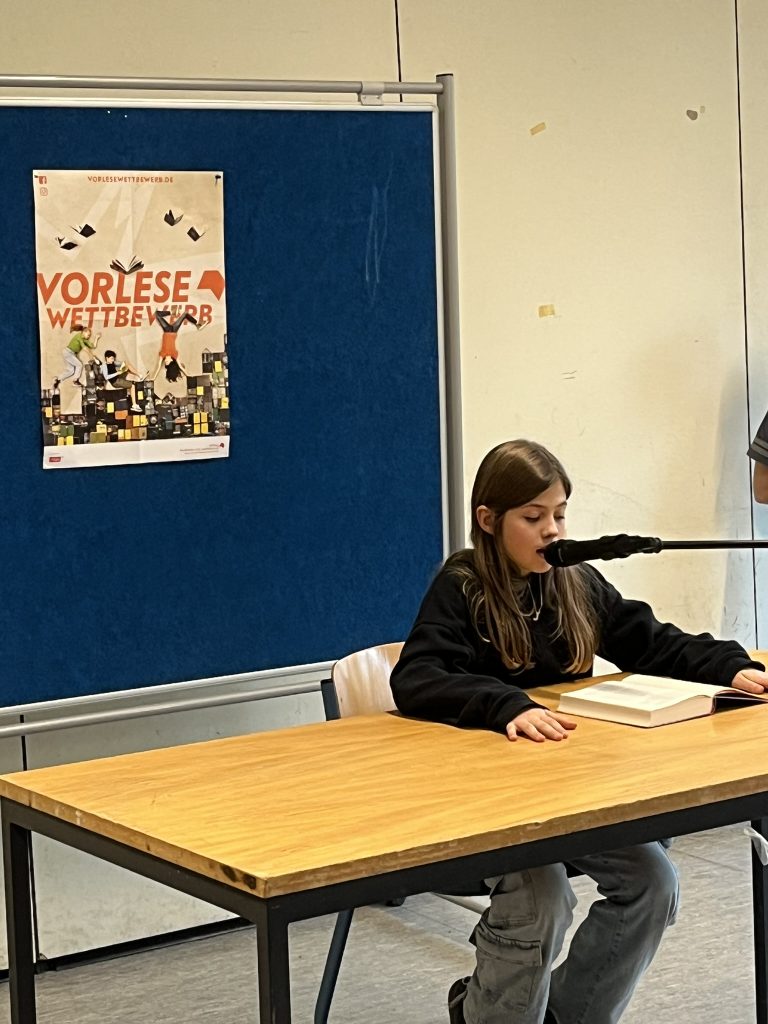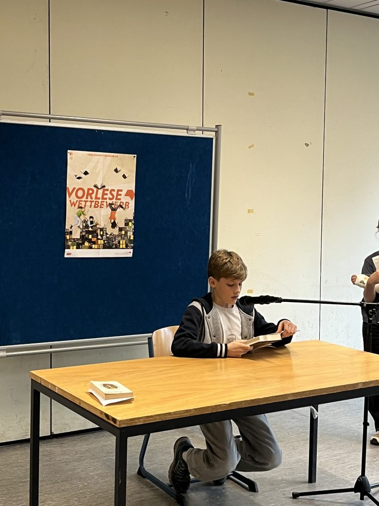 Am 5.12.25 fand der diesjährige Vorlesewettbewerb der 6. Klassen in der kleinen Mensa statt. Als Klassensieger:innen hatten sich vorab qualifiziert: Theo Christott (6a), Jonna Eggert (6b), Mieke Keller (6c) und Elliott Goda (6d). Sie traten nun gegeneinander an und lasen jeweils einen selbstgewählten Text und einen Fremdtext. Dabei zogen sie die ca. 120 Sechstklässler:innen in ihren Bann.