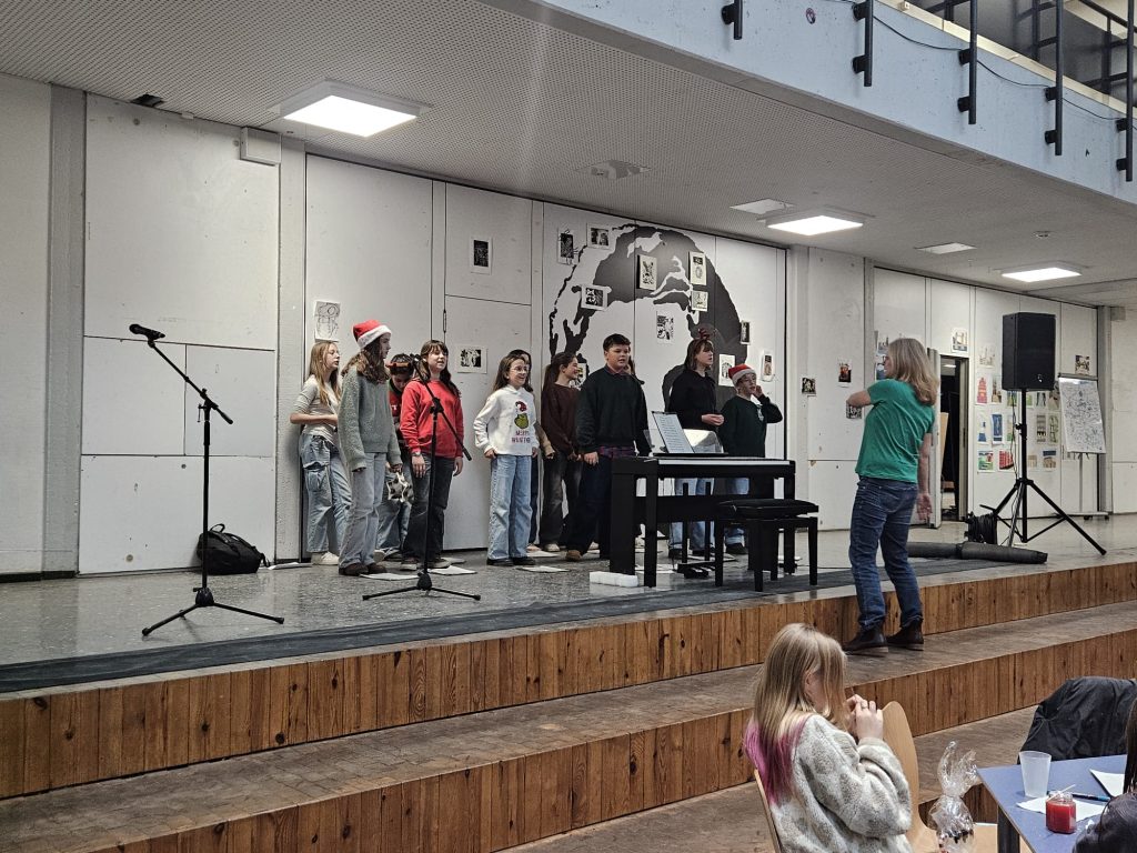 Ein besonderes Highlight des Nachmittags war der musikalische Beitrag des Schulchors. Mit seinen Liedern verzauberte er das gesamte Atrium und sorgte für eine weihnachtliche Atmosphäre.
