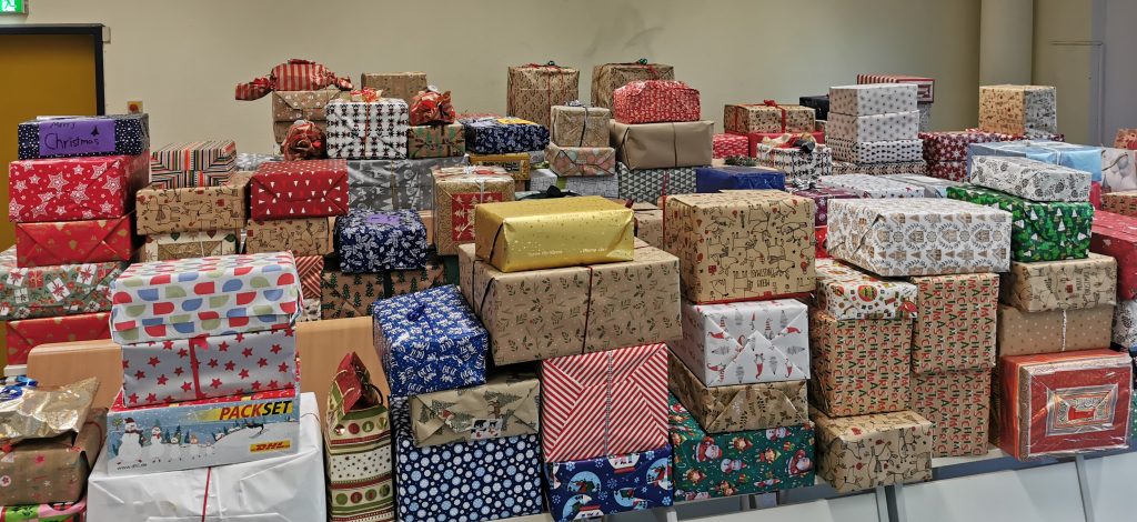 Im 6. Jahr unserer Lebensmittel-Spendenaktion für die Tafel unter dem Motto „Fröhliche Weihnachten für Alle“ sind wieder viele liebevoll verpackte Kartons mit Leckereien zusammengekommen.