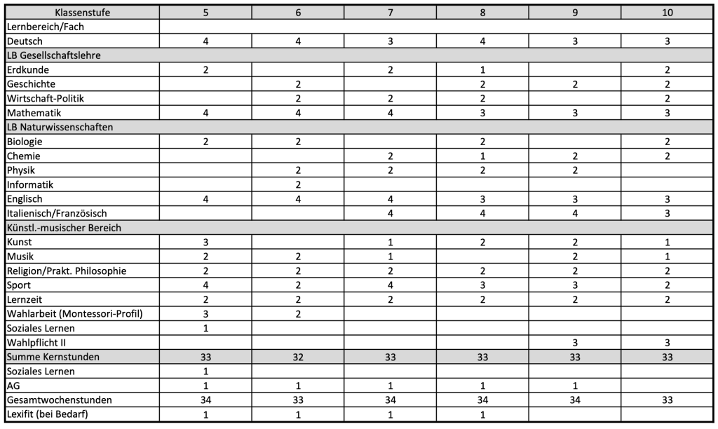 Hier finden Sie die Stundentafel des Montessori Gymnasiums für den Bildungsgang G9