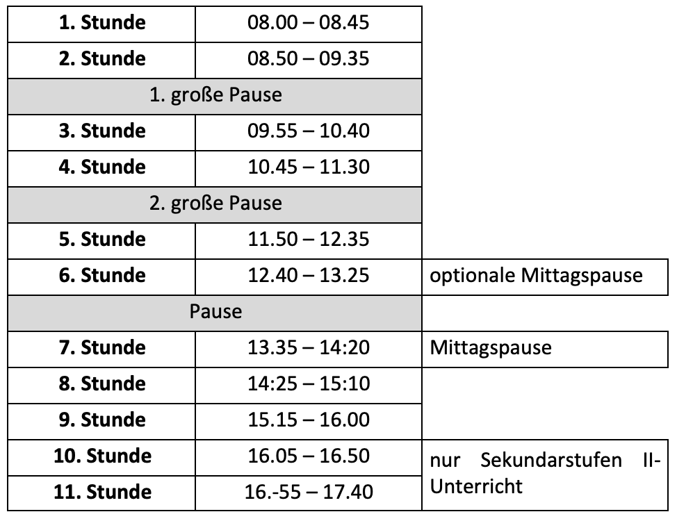 Der Unterricht beginnt um 08.00 Uhr und findet überwiegend in Doppelstunden statt. Zwischen Vor- und Nachmittagsunterricht gibt es eine Mittagspause, in der Regel nach der 6. Stunde und in wenigen Fällen nach der 5. Stunde.